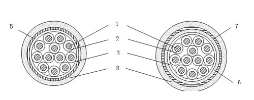 5--- 銅帶屏蔽; 6--- 內(nèi)護(hù)層; 7--- 鋼帶鎧裝; 8--- 聚烯烴護(hù)套。